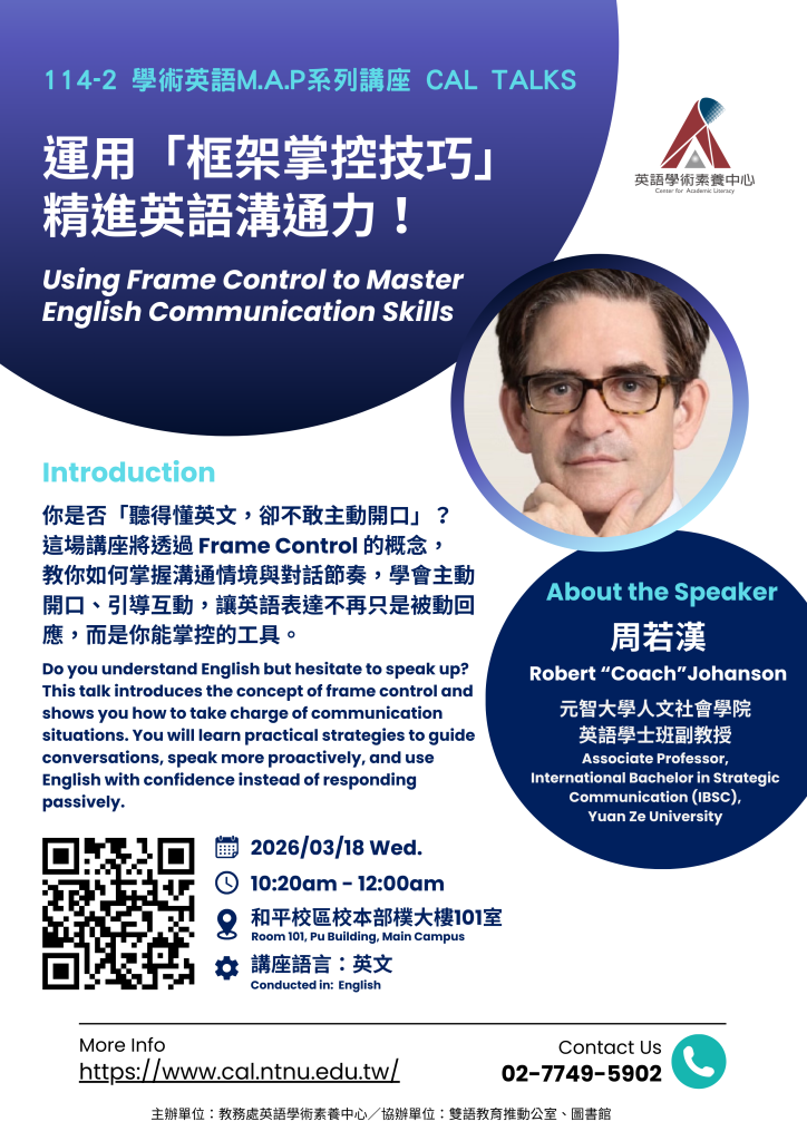 114-2學年度OBE、CAL持續與Fulbright合作,舉辦一系列講座活動與工作坊,非常歡迎師長、同學們多多蒞臨參與,一起交流分享!