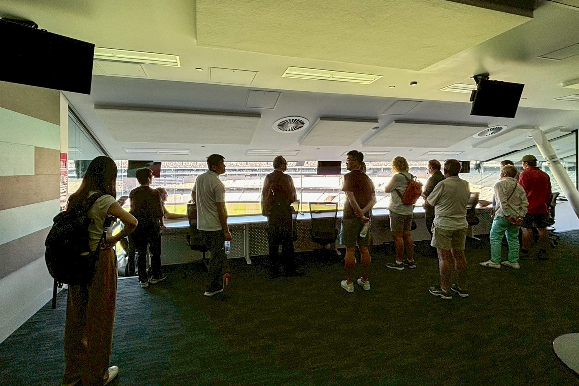參訪團亦深入更衣室、教練室與媒體中心等區域,並觀察到場館在通風、遮陽與座位調整等方面的細緻設計,例如常年開放的天窗有助於通風降溫,屋頂延伸設計可為新增座位提供遮蔭。場館亦設有近百間室內外包廂(suite),採使用者付費方式提供共享空間,兼具觀賽與社交功能。平日場館由約105名正職人員維運,大型賽事或演出時則動員約1700名工作人員,展現大型運動場館的專業營運模式。