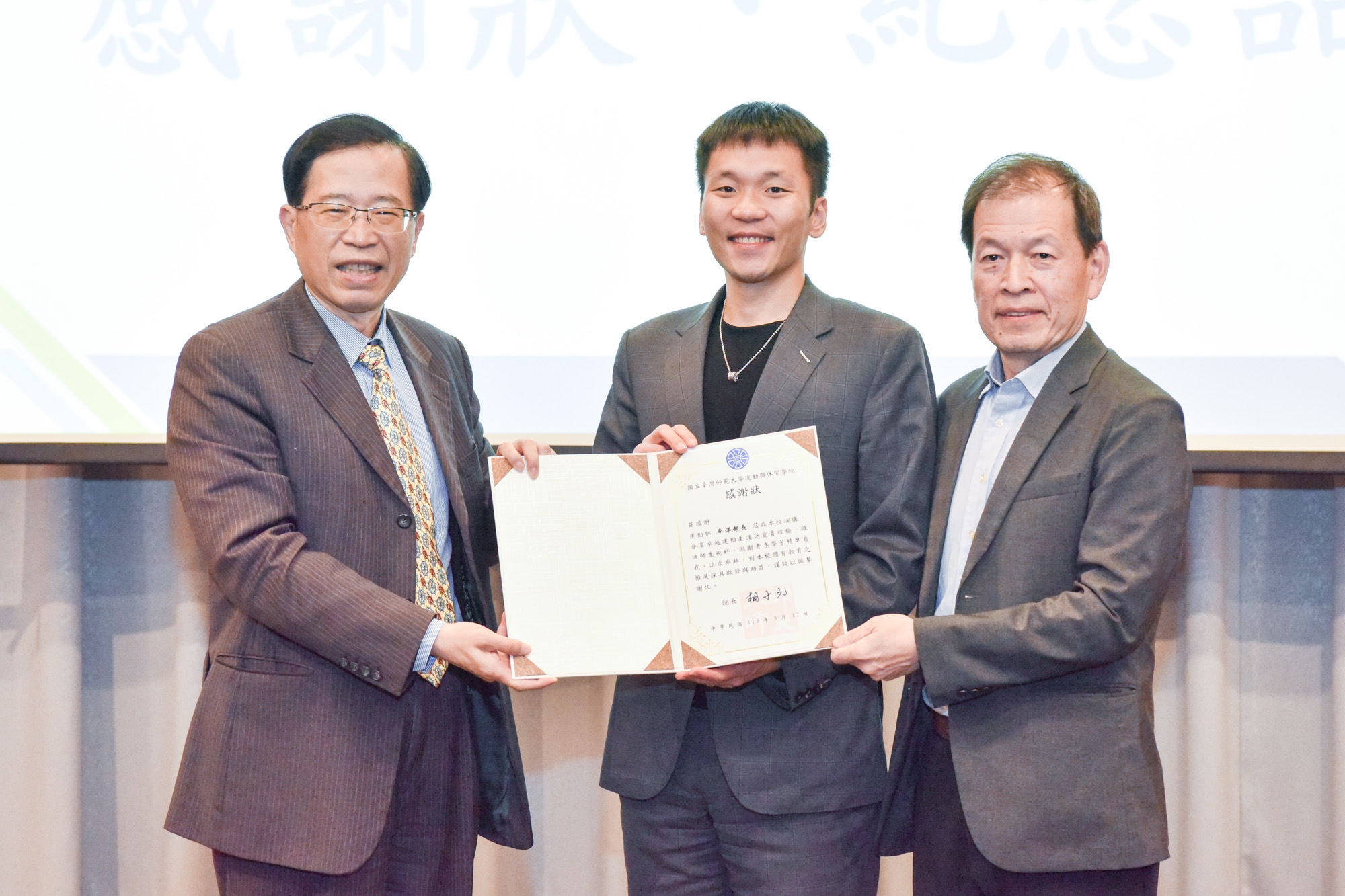 講座開始前,宋曜廷校長致詞表示,李洋部長不僅是傑出的運動員,更是身體力行、積極投入改革的典範,展現出過人的毅力、勇氣與卓越的擔當。隨後他也代表致贈感謝狀及校景瓷盤,感謝李洋部長蒞校分享。