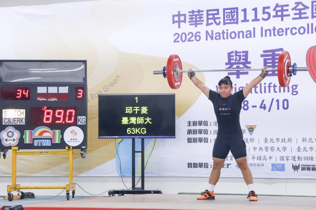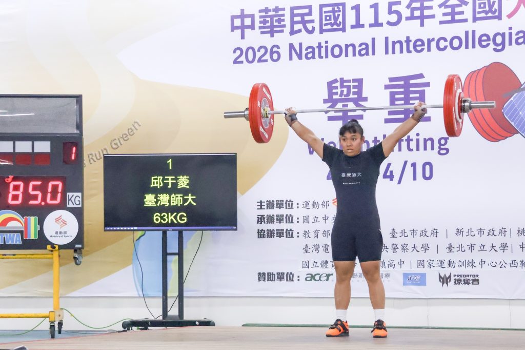 115年全國大專校院運動會舉重賽事於4月9日在國立體育大學持續進行,國立臺灣師範大學選手邱于菱在公開女生組63公斤級決賽中,以抓舉85公斤、挺舉111公斤、總和196公斤的成績奪得金牌,為臺師大再添佳績。